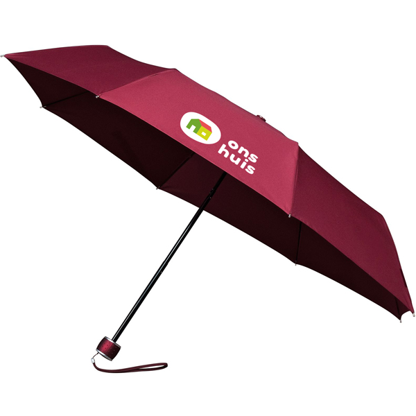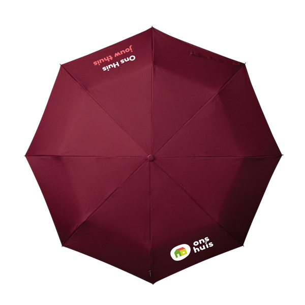 Opvouwbare paraplu, windproof, 3-delig, metalen stok, zwarte glasfiber baleinen, bijpassend gekleurd handvat, met foedraal. Inclusief bedrukking logo ''Ons Huis'' op 1 segment in full colour.